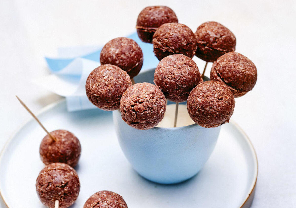 Sulata 20 g suklaata (katso kohta 1) ja yhdistä kaksi puolikasta palloa kokonaiseksi palloksi sulatetun suklaan avulla. Aseta pallot puutikkuihin.